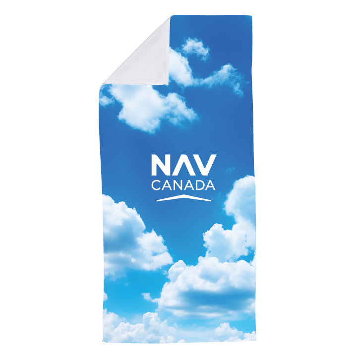 Soak up the sun, then dry off in style! Our 28" x 58" ultra-performance beach blanket/towel features the NAV CANADA logo soaring through the clouds. Towel is 300GSM with cam hem. 100% Soft, poly velour front with 100% cotton terry backing for maximum comfort. Great for beach, boating, hiking and other outdoor events! Machine washable for easy cleaning.